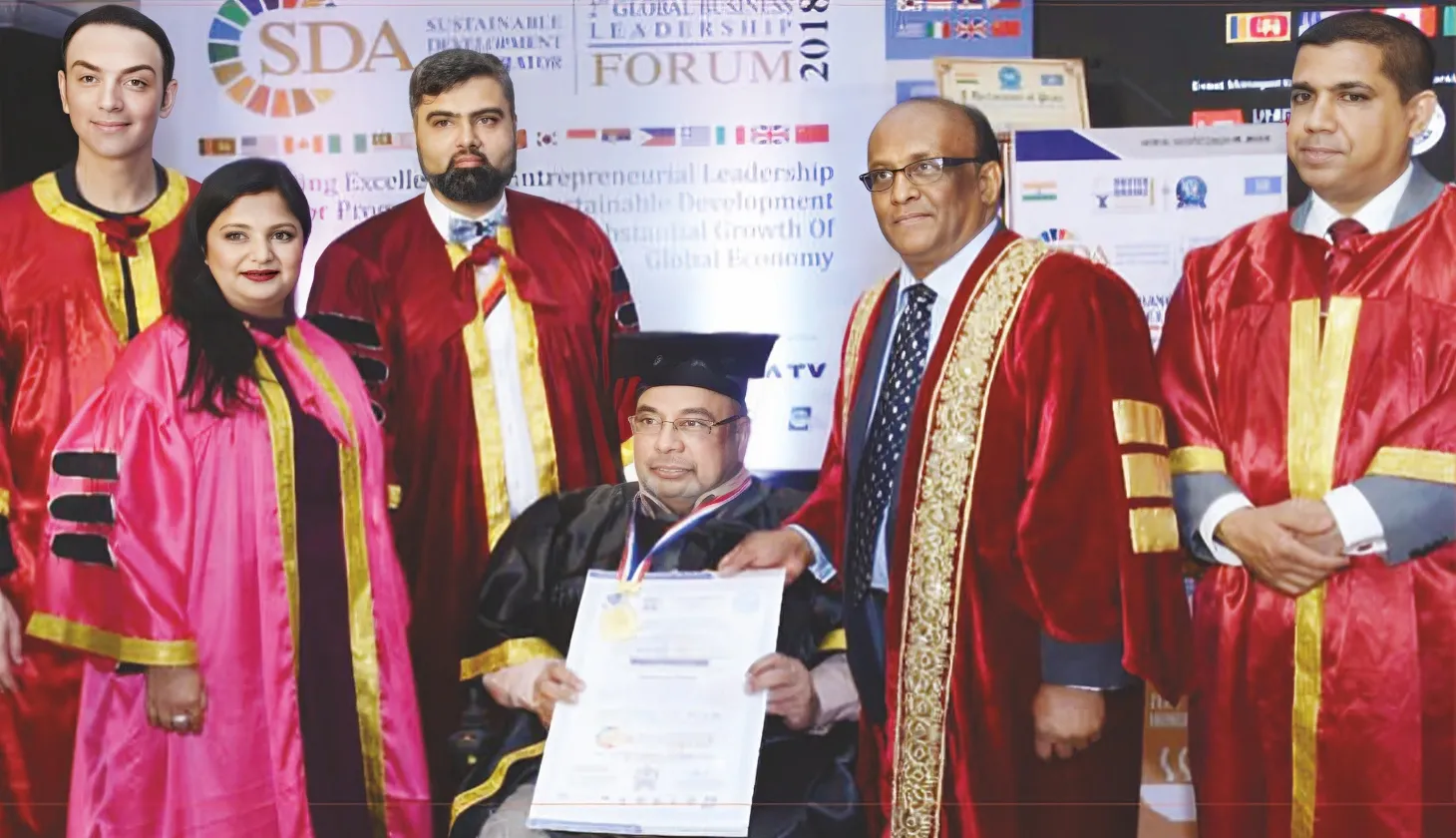 “Dr. Jashvant Shah has been entitled with his prestigious Doctorate Degree certificate & Gold Medal”- by those awarded from left, Dr. Neetu Singh, Dr. Roland Yakubov, Dr. G.D. Singh, Dr. Lakshman Madhusudan Singh, and Dr. Romesh Dwara.