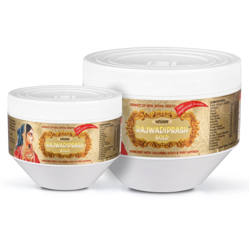 Rajwadiprash Gold is fortified with Suvarna bhasma, Rajat bhasma, and saffron, like other precious ingredients. This product is especially designed to be sugar-free for diabetics, particularly those who can not benefit from traditional Rajwadi Prash due to its added sugar content. Rajwadiprash Gold is completely Sugar-Free, made safely and securely for diabetics, allowing them to enjoy its benefits without increasing their sugar levels.